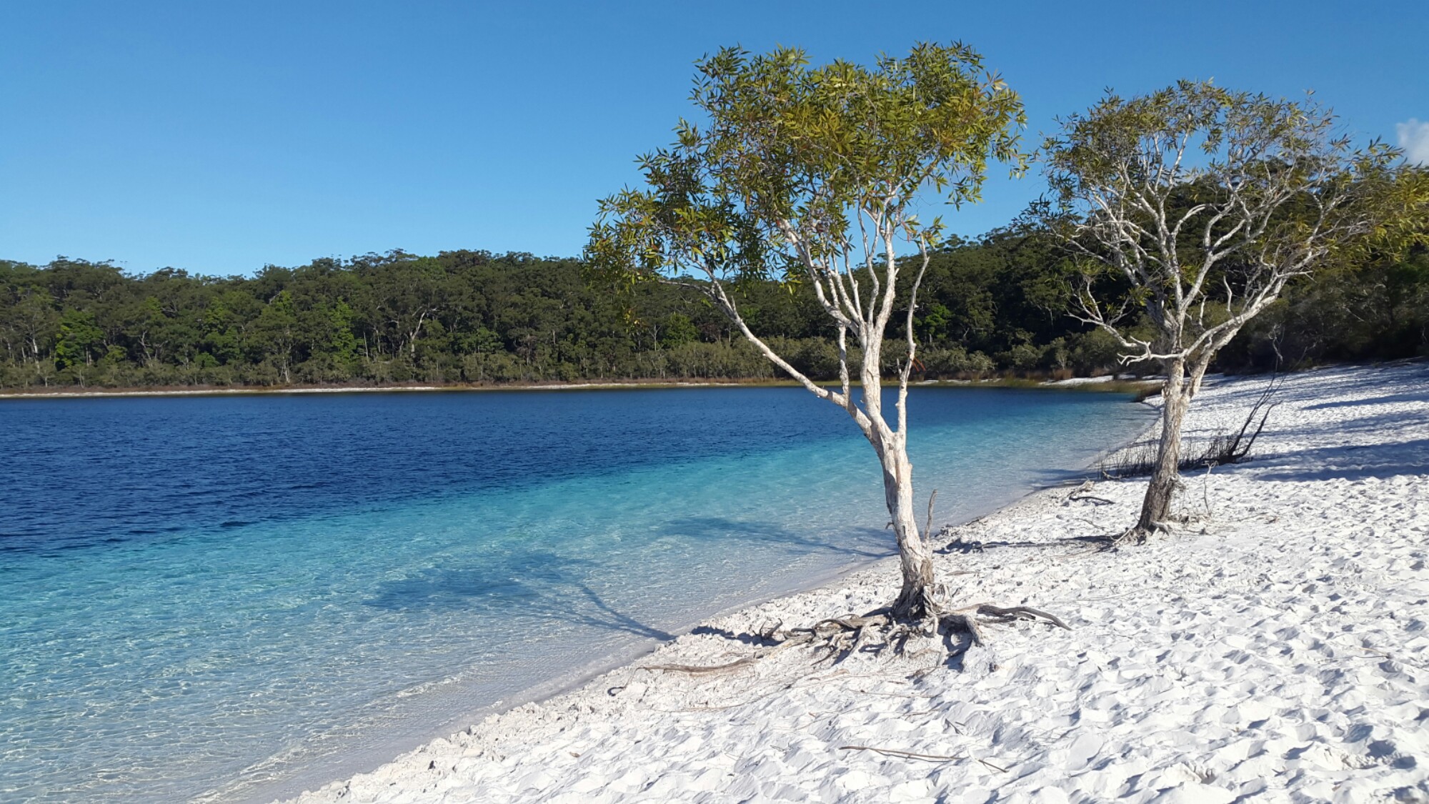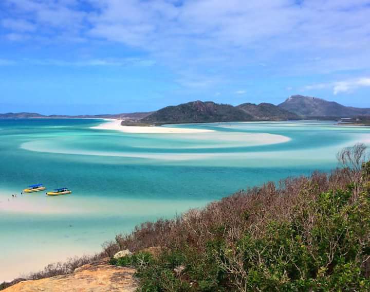 Les villes côtières que nous avons traversées sont Byron Bay, Brisbane, Cairns. Les activités récréatives sont multiples : surf , kayak , plongée, snorkling (plongée avec tuba). Mon aventure la plus marquante avec l’océan fut trois jours à naviguer sur un voilier (de son petit nom British Defender). Nous avons même participé à lever les voiles. Quand le navire penchait sur un côté (parfois presque à la verticale), il fallait se tenir fortement. Au bout du périple maritime, apparaissent les îles Whitsundays. On grimpe sur une coline et on découvre un coude maritime où l’eau se décline dans des teintes de bleu différentes. Une vraie carte postale surréaliste (voir illustration). D’ailleurs la plage située à cet endroit s’appelle Paradise Beach, à raison. Autre paradis visité, l’île Fraser Island cachant une forêt tropicale et des petits lacs à l’eau turquoise (voir photo 2).
