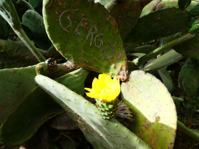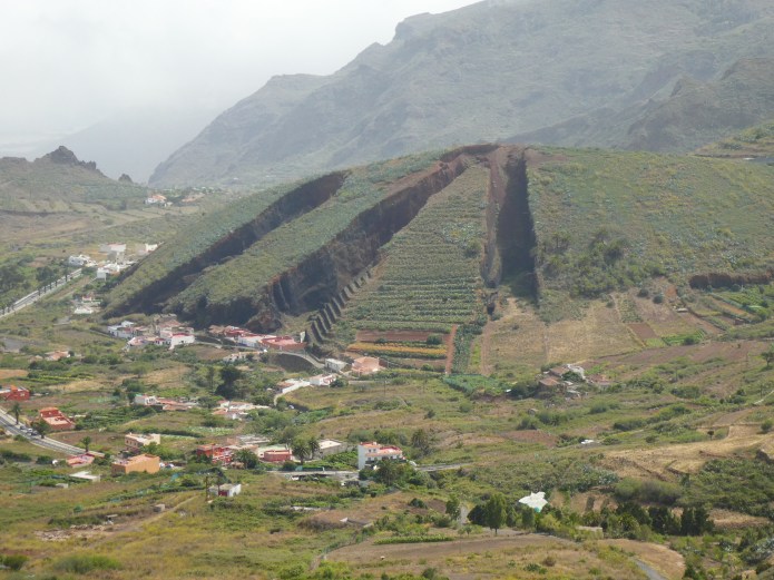 Pour éviter de se heurter à d’autres portes closes, nous avons pris de la hauteur dans le petit village de Masca. La route pour y accéder est tortueuse avec des virages en tête d’épingle. Nous pouvions potentiellement descendre de ce village jusqu’à la mer. Pour cause d’effondrement de terrain, notre route s’est vite arrêtée. Pendant notre courte marche, nous avons découvert des graffitis d’un nouveau genre: graver son nom dans un cactus (ne reproduisez pas ça chez vous)! En continuant notre route, nous nous sommes arrêtées à El Palmar, qui se distingue par colline effondrée à plusieurs endroits (voir la galerie ci-dessous).
