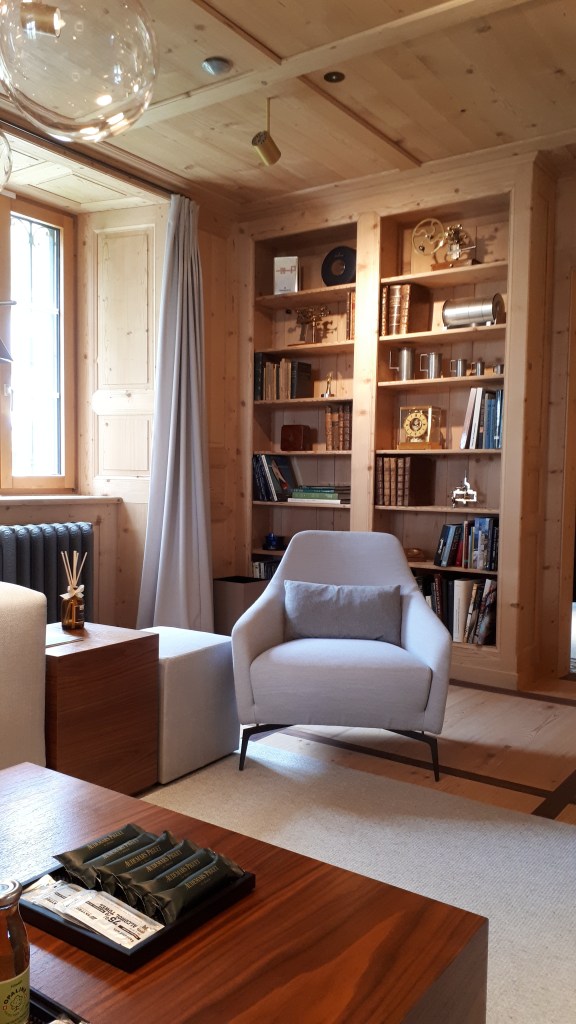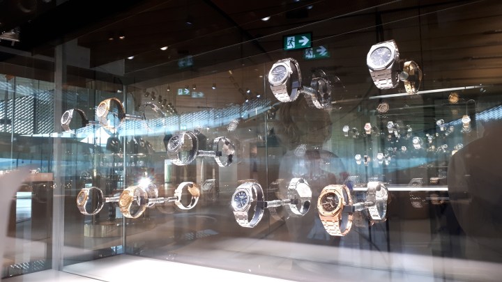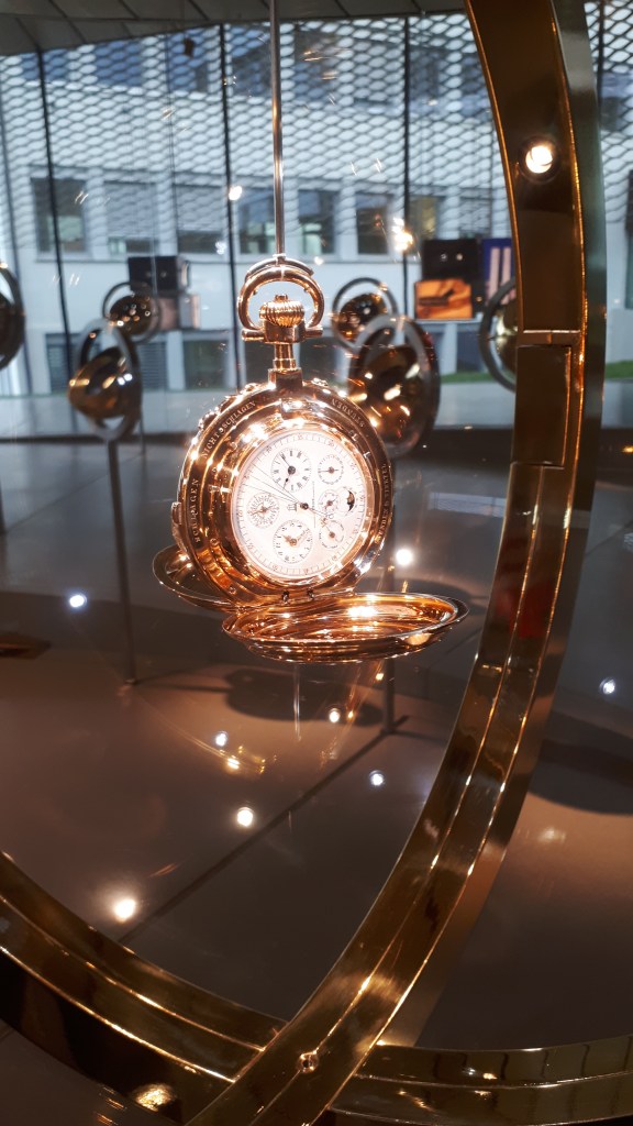 En descendant d’un étage, on arrive à la cave (pas de grand dépaysement pour la Valaisanne que je suis!). Puis on débouche sur le vaste hall d’entrée, lumineux. Partout où se posent nos yeux, des merveilles : le vitrage donnant sur la vallée de Joux, la finesse du mobilier, l’équilibre entre le dépouillement et la richesse. L’exposition présente des modèles rares, comme des anciennes montres datant des fondateurs Audemars et Piguet, mais aussi des plus récents décernés à des stars du sport (Schumacher, Lebron James, Serena Williams). Le modèle le plus emblématique est la Royal Oak. L’objectif de ce modèle était de toucher toutes les générations et d’être portable en tout contexte, du court de tennis, au travail jusqu’à la soirée au cinéma. Un nouveau paradigme qui détrône la lourde montre en or de mamie que l’on porte à chaque mort d’évêque.