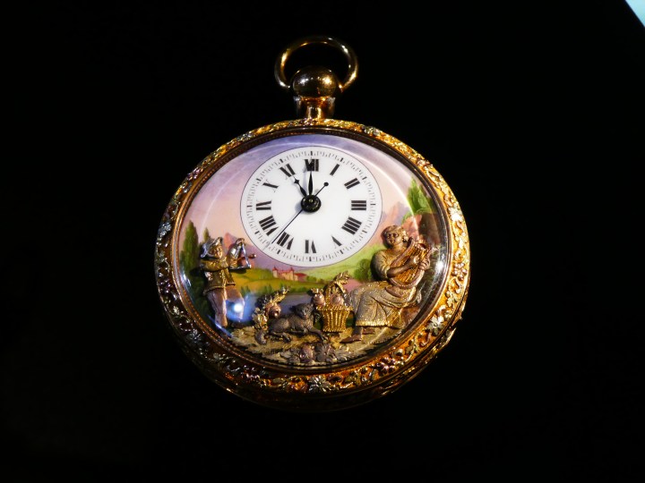 Pour cette visite sur inscription, nous sommes quatre. Un couple manquant à l’appel, la visite guidée prend des allures de cours particulier, à notre grand bonheur! Le public est composé d’amateurs de belles montres venus de Lausanne et Genève. Une visiteuse travaille pour une marque de luxe française et fait visiter ses clients dans ce type de lieux prestigieux. Un vigile très sérieux fait le contrôle des tickets et de l’identité de chaque visiteur. Avec un système de badge, personne ne rentre ni ne sort par hasard de cet imposant bâtiment. Vu la valeur des pièces exposées, c’est compréhensible. « Nous pouvons dire que nous nous promenons dans un coffre-fort », confie la guide, habituée des lieux.