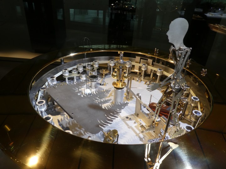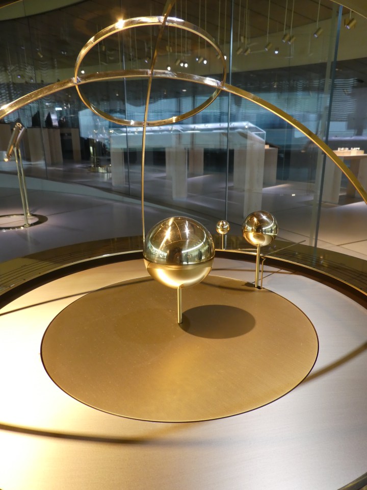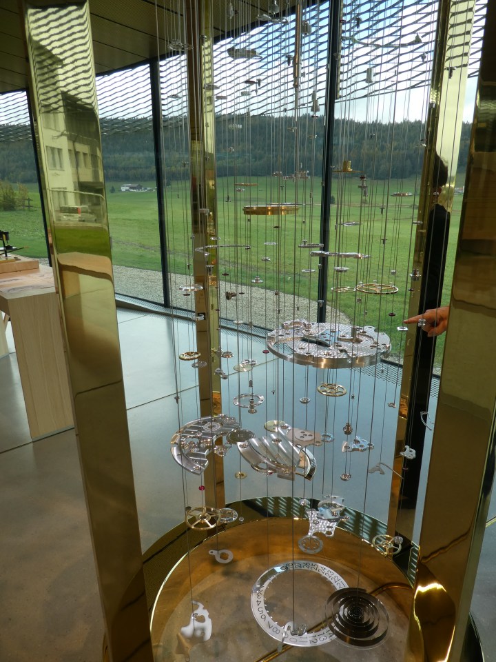 Des maquettes montrent les pièces détachées des mouvements, dont le tourbillon. Un automate remarquable représente un bonhomme marchant à la marche aux champignons. Des mécanismes s’animent joyeusement, nous rappelant notre enfance. Sur des structures en étain, des planètes se mettent en mouvement pour nous rappeler la mesure de temps. Une installation particulièrement impressionnante est un « éclatement », composé d’éléments d’une montre, suspendus par des fils. Il a été fabriqué par des apprentis horlogers. La guide pointe un rubis du doigt: « De nos jours, les rubis sont majoritairement fabriqués en laboratoire. Et ils coûtent presque autant que les vrais! »