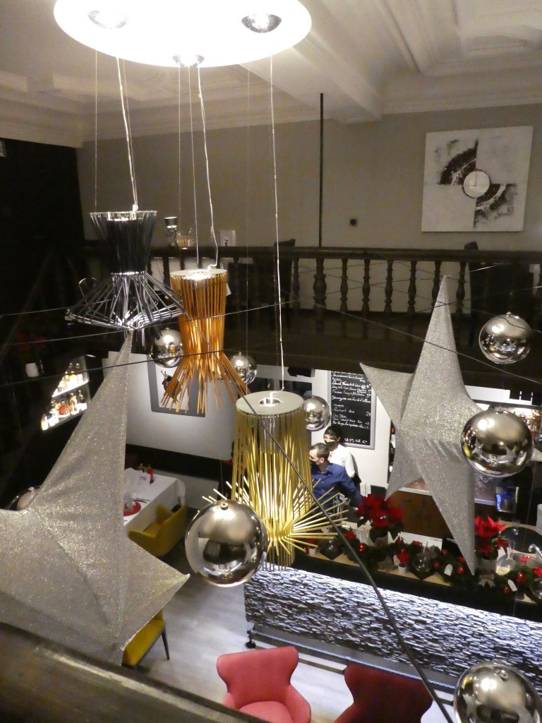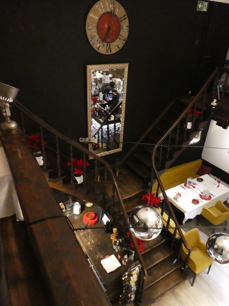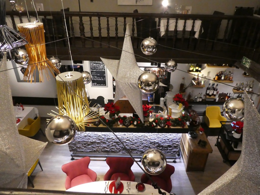 La porte franchie, on ne sait pas où poser ses yeux : le grand bar et son alignement de bouteilles au mur, les étoiles de Noël géantes accrochées au plafond, le grand escalier en bois en face de nous, tout nous interpelle. Le mobilier ancien côtoie le très moderne, dans un joyeux méli-mélo coloré. Au moment de nous asseoir, nous avons le choix entre la salle principale au rez-de-chaussée, une salle séparée ou à l’étage supérieur, dans la galerie. Avec mon compagnon, nous nous décidons pour la galerie, car on le sait, d’en haut tout est plus beau! Nous gravissons les marches de bois qui craquent sous nos pieds. Nous voilà installés à une jolie table, avec une vue en contre-bas, comme à l’opéra. On ne vous cache pas qu’on a guigné dans les assiettes des voisins.