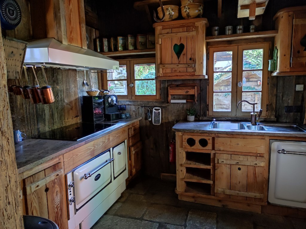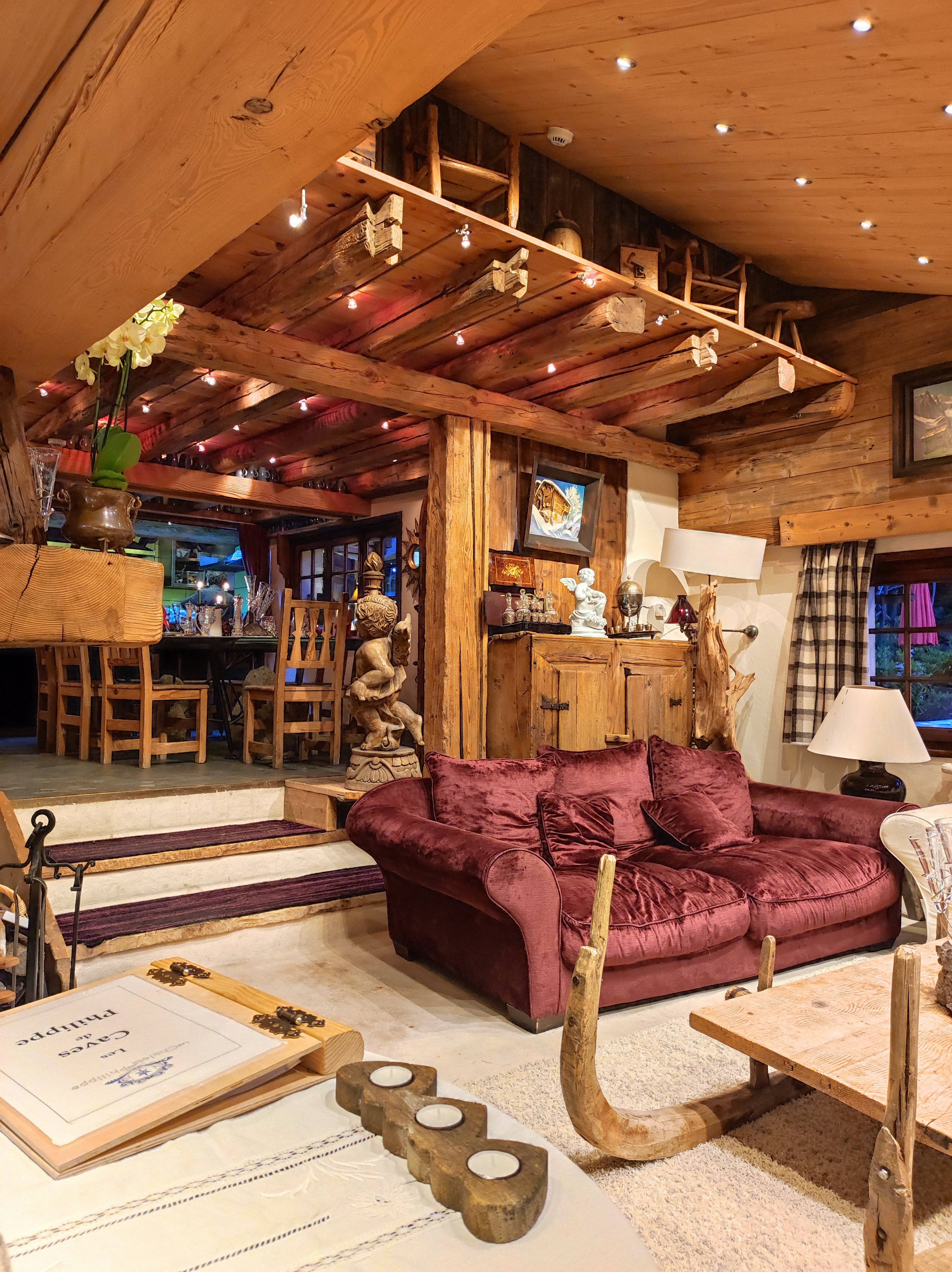 Pour le plaisir de guigner, on nous a ouvert la porte d’un chalet de rêve….Il n’accueille ni vilains gnomes ni harceleurs sur Internet (« trolls »), mais des familles ou des groupes. Il est si vaste qu’on peut déambuler à plusieurs sans se marcher sur les pieds. La cerise sur le gâteau se trouve sur le balcon : deux jacuzzis de 6 places ! Ni kitsch, ni vieillotte, la décoration montagnarde et ancienne est choisie avec goût.