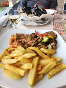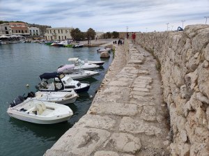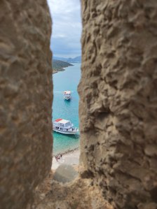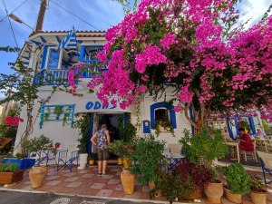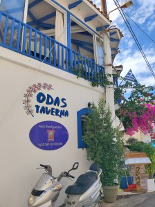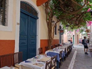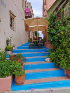 Cette visite rappelle à quel point il faut se méfier de ce qu’on voit sur les cartes postales. On nous vend le calme, des rues désertes et un vieil homme qui se repose sous une glycine. En réalité la glycine est bien là, mais le vieil homme n’est pas vraiment tout seul. La partie portuaire avec sa lignée de bars touristiques est hideuse. Les touristes se suivent en procession jusqu’à l’entrée de la forteresse pour la visite (queue trop longue, nous avons renoncé). Découvrez le récit de notre dîner au chapitre « Où manger ». Les points intéressants à relever sont les témoignages de l’ère vénitienne de l’île, avec le port et son phare, d’anciennes colonnes et des palais à l’intérieure des charmantes ruelles. Il y a également un minaret qui atteste de la présence des Ottomans.
