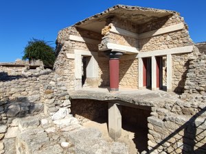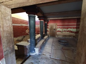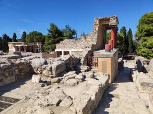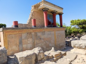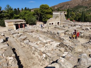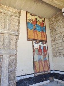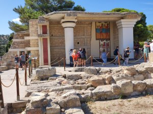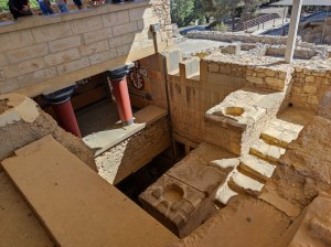 Pour s’y rendre, on sort de la ville d’Héraklion en direction plein sud (5 km de distance). Nous sommes entrés avec notre billet combinant le musée d’archéo et le palais pour 20€/pers. Ce site majeur en Crète a été découvert par l’archéologue Sir Arthur J. Evans en 1900. L’Anglais ne fait pas dans la dentelle en le faisant restaurer, à l’aide de coffres en béton pour soutenir les murs et de gros coups de pinceau pour rafraichir les fresques. A sa décharge, si ces couleurs nous choquent aujourd’hui, il est attesté que les grecs peignaient effectivement leurs statues. Notre œil contemporain est faussé, car habitué à voir des statues délavées par le temps (voir la vidéo de l’archéologue Charlie Danger à ce sujet).