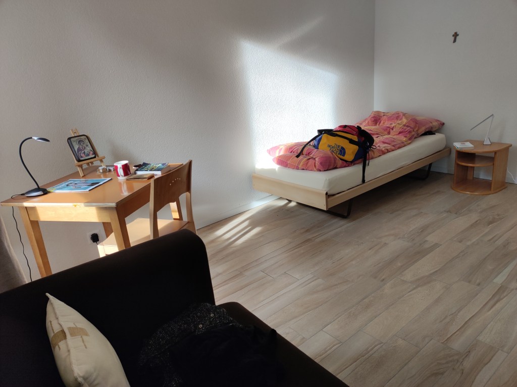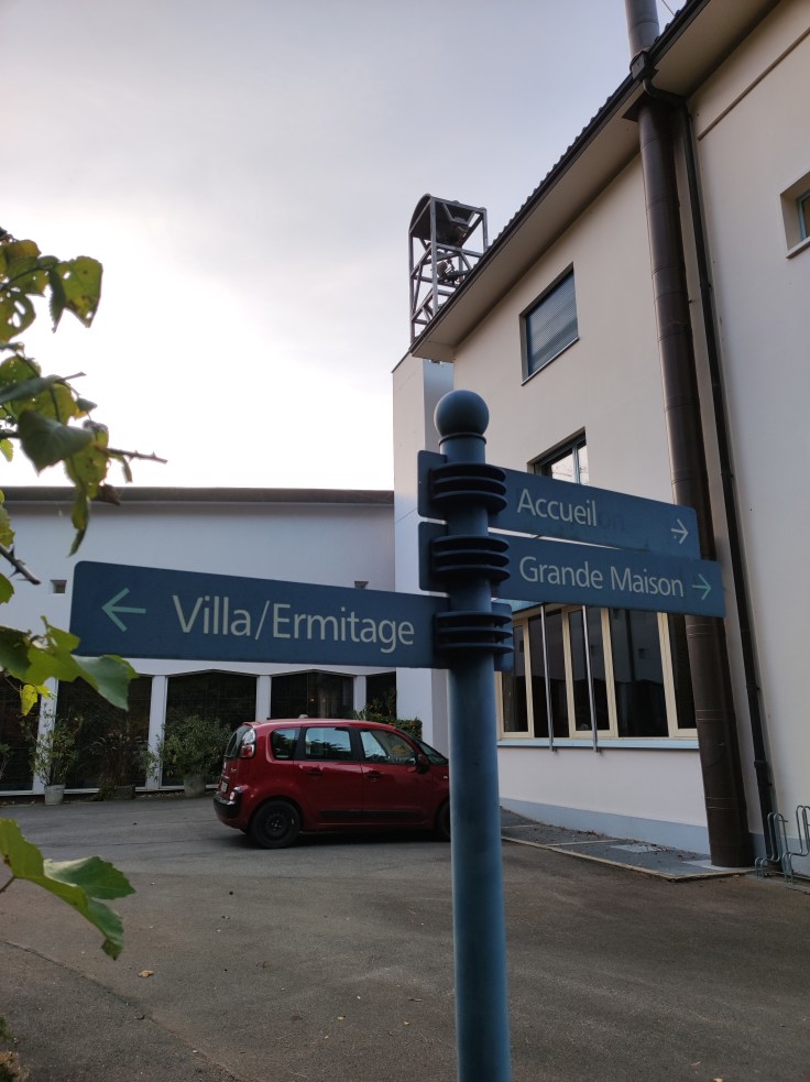 Je gare ma voiture en contrebas du couvent et m’atèle à trouver la Villa où je vais séjourner. Non sans mal, car l’accueil principal est fermé. Dans un Escape Game normal, le maître du jeu te donne les clés pour accéder à la mission. Assez débrouille, j’ai trouvé ma chambre, ouverte, avant ma clé. Elle m’est venue plus tard des mains d’une intendante de la Grande Maison. La Villa, quant à elle, a été rénovée en 2015. En plus des chambres individuelles, elle dispose d’un espace commun splendide. Une cuisine moderne, des hauts plafonds, tables de lecture, grand tapis pour le yoga…L’incarnation de la collocation rêvée.