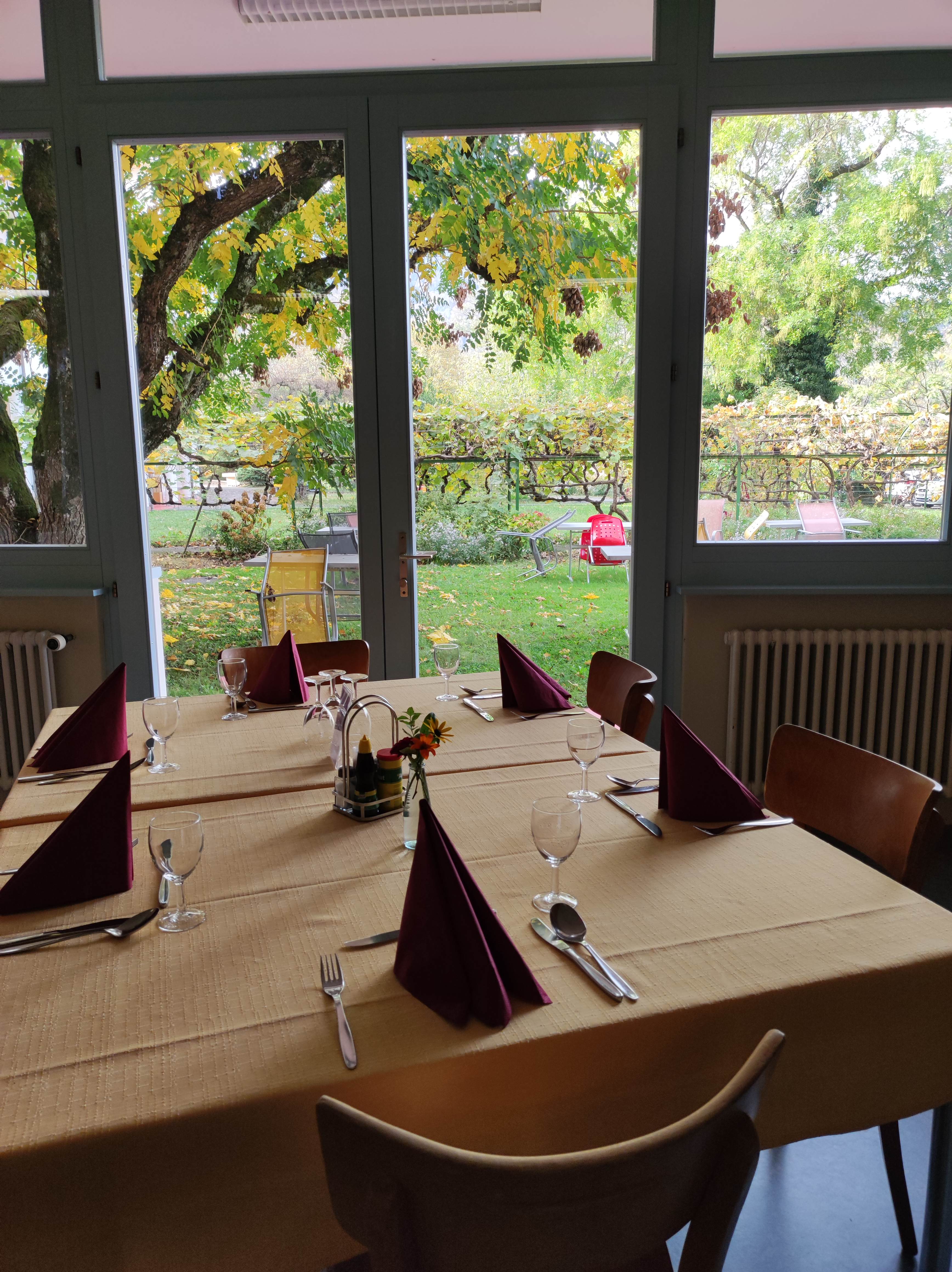 Dans la salle à manger de la Grande Maison, les tables sont réparties par groupe. Les habitants de la Villa mangent ensemble et le contact passe bien. Entre une Valaisanne, une Fribourgeoise, une Canadienne et un Lyonnais, les débats vont bon train. Cela passe par le vocabulaire gastronomique : qu’appelle t-on une tourte ou un gâteau, un saucisson ou du salami. Le saucisson vaudois et le papet vaudois font l’objet de vifs débats. L’ambiance est conviviale, même s’il faut veiller à ne pas parler trop fort.