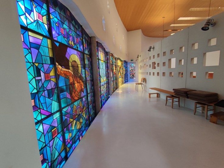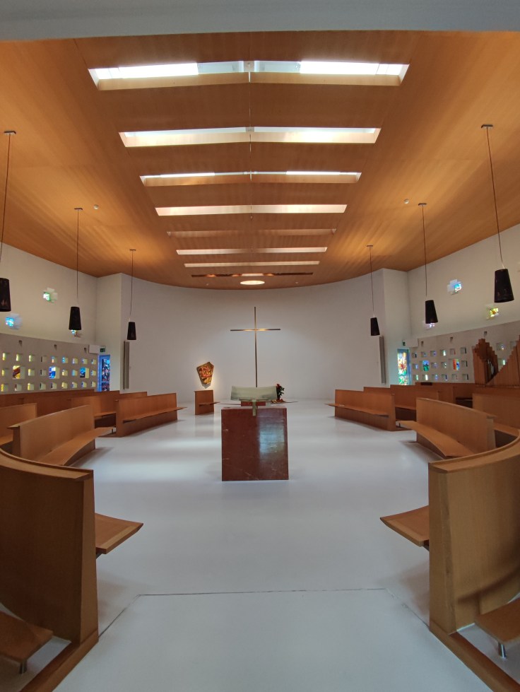 J’aurais pu rester sous les combles à lire, écrire et cogiter. Mais j’ai trop la bougeotte pour ça. Du coup, je me suis rendue à la messe le samedi. Pas à l’aube pour les Laudes, c’était le week-end, faut pas déconner. J’ai choisi Sexte, aux environs de midi. La chapelle est baignée de lumière et chaleureuse. Les sœurs s’inclinent très bas devant la croix avant de s’asseoir, Bible et cantique à la main. Sexte consiste en 15 minutes de chants liturgiques. J’étais venue les mains vides et je contemplais la sœur qui interprétait ses solos avec un coffre admirable. Une religieuse derrière moi s’en est allée quester pour moi une Bible et un bout de papier avec le chant en question. Du coup, je suis restée coite, mais avec un papier dans les mains (ça fait plus sérieux). Ce silence entre les chants, cette réunion d’âmes paisibles était assez réconfortante. Néanmoins, la moyenne d’âge de l’assistance ne laisse planer aucun doute sur l’état de l’église actuel. Peut-être que proposer du Gospel au répertoire pourrait apporter un vent de fraîcheur.