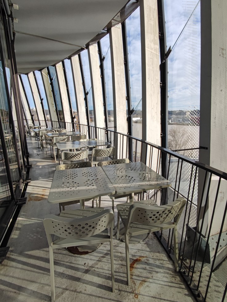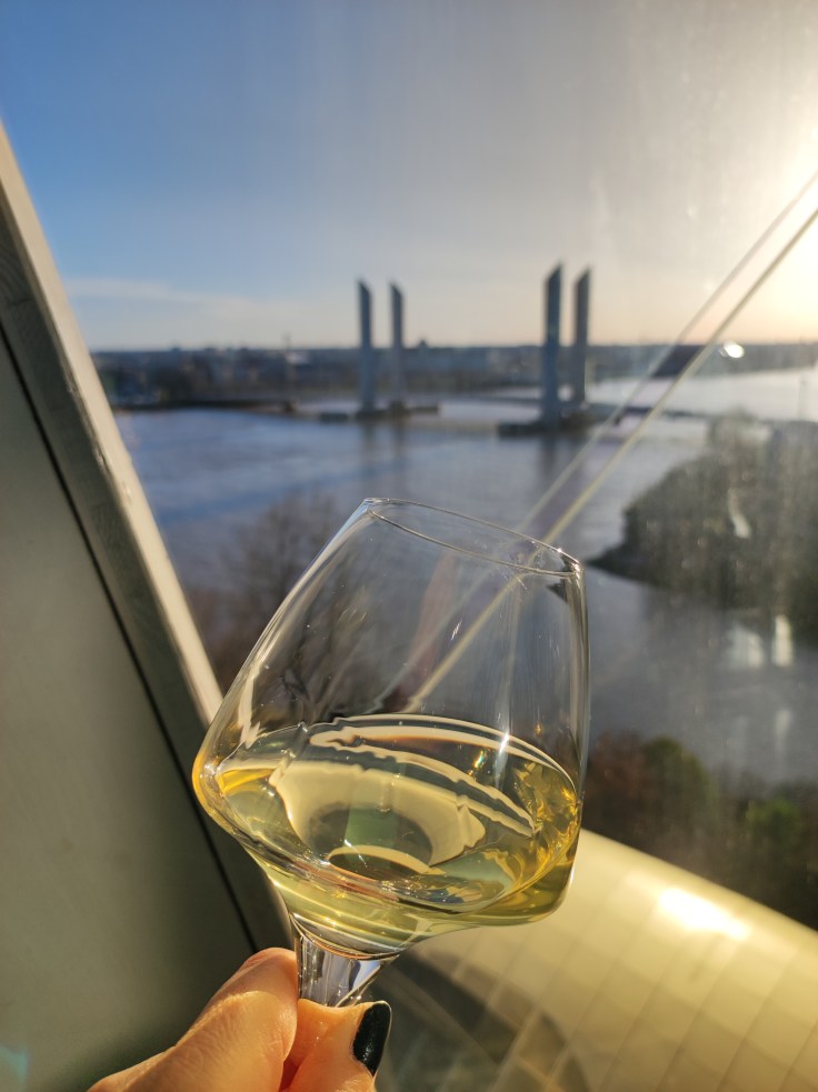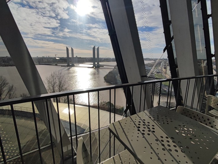 En fin de visite, les visiteurs sont invités à monter au 8ème étage pour déguster un cru de son choix. Nous avons jeté notre dévolu sur un Viognier Pays d’Oc et un Pessac Leognan blanc. De là-haut, on aperçoit le fleuve de la Garonne qui sillonne le long des quais et les impressionnants piliers du pont Chaban Delmas qui s’élancent vers le ciel. Pour le repas de la Saint-Sylvestre, nous avons mangé au restaurant Le Sept (7ème étage, voire 7ème ciel). Nous avons attaqué avec un tataki de bœuf pour madame et ceviche de poisson pour monsieur. En plat principal, du poisson sauvage, ris de veau accompagnés d’une déclinaison de choux fleurs. Le sommelier nous a fait goûter un Pinot Noir bordelais de 20 ans d’âge, qui rappelait le goût du Porto.