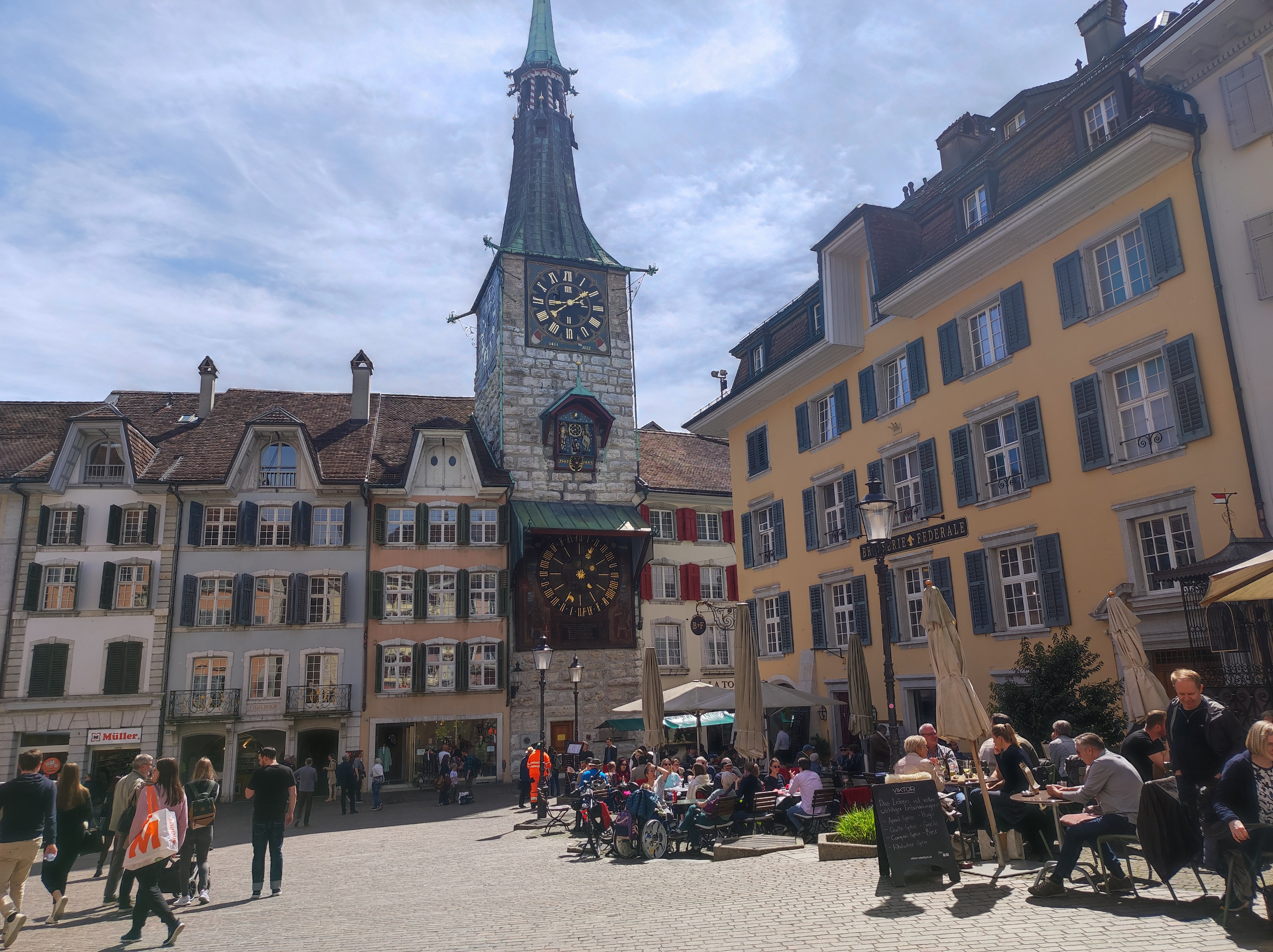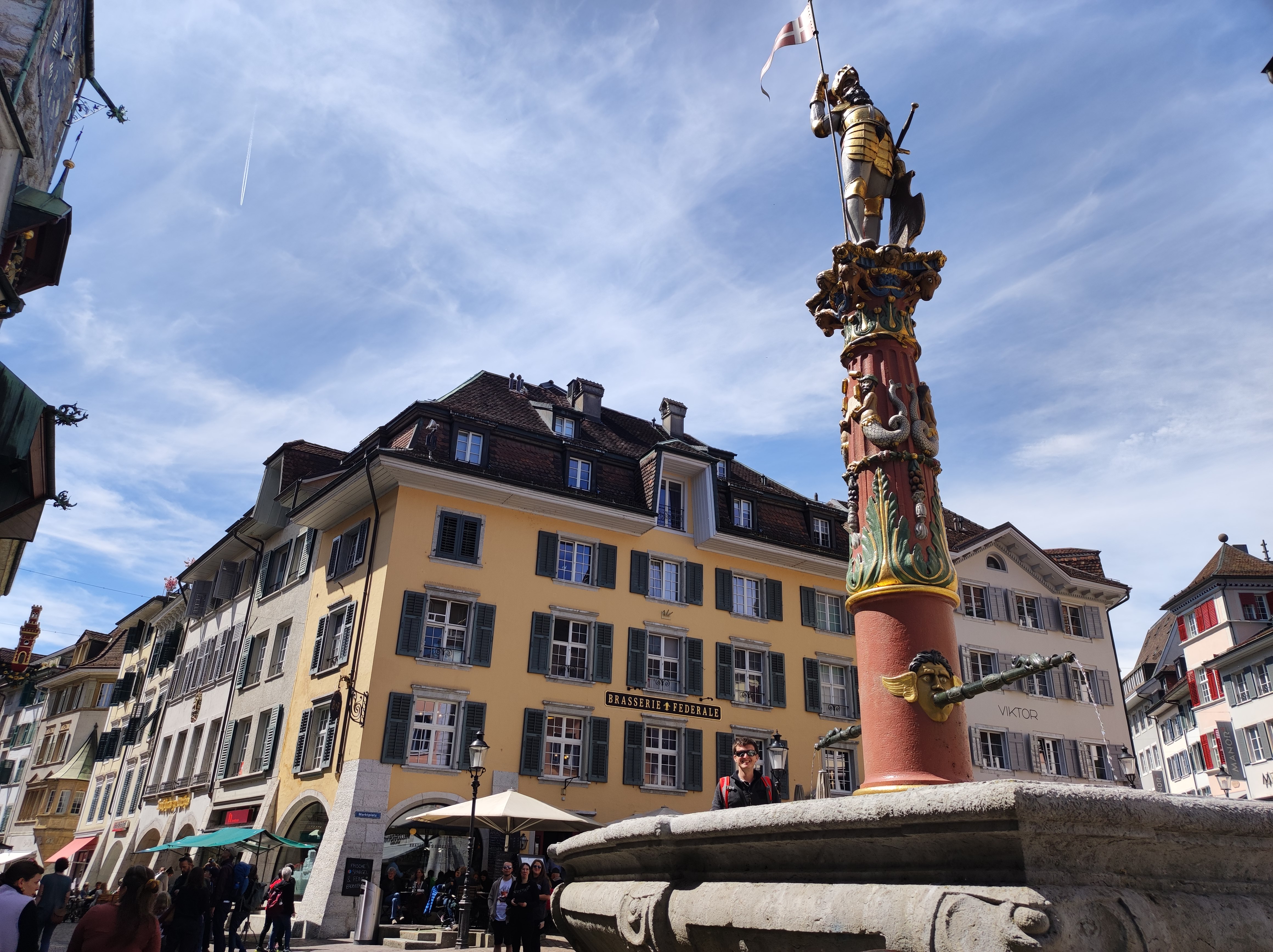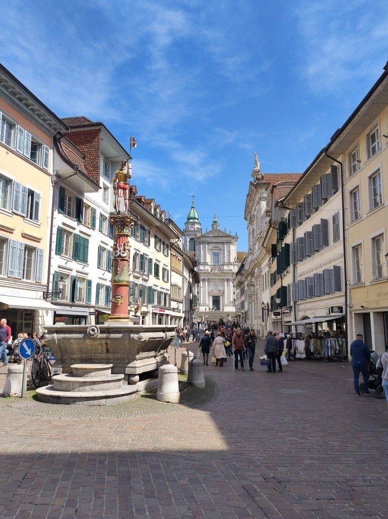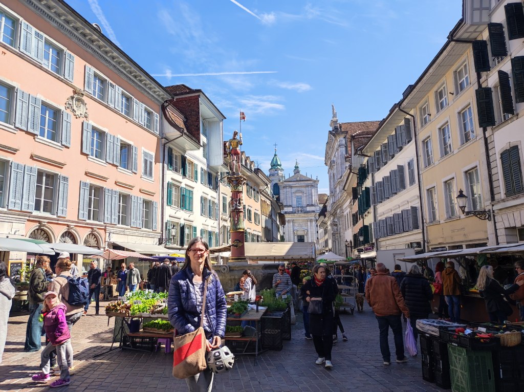 Sur la Marketplatz, le marché de Pâques bat son plein. On vend des fleurs, du fromage, du saucisson…Au loin, on aperçoit l’imposante cathédrale Saint-Ours qui domine la ville.