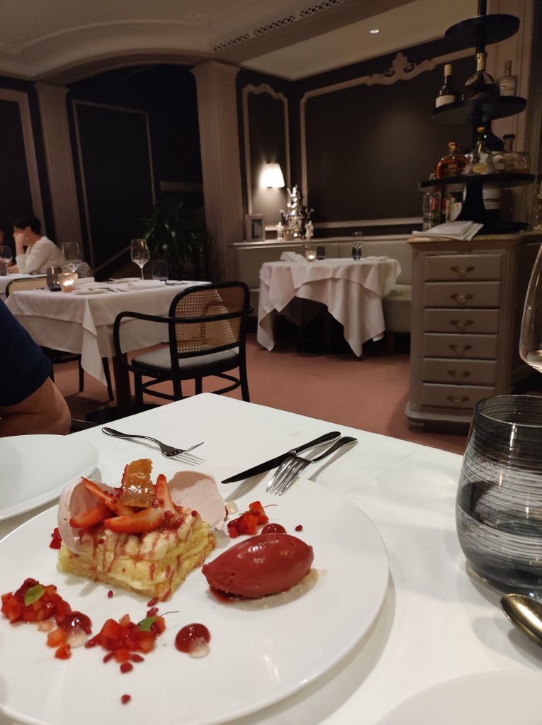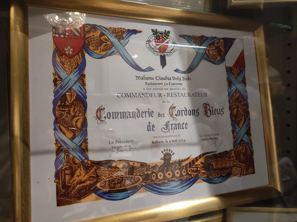 Nous avons soupé à l’hôtel-restaurant la Couronne (****), qui jouxte la cathédrale. Le cadre est raffiné et chaleureux. Pour le repas, les entrées et le dessert ont été amenés sur des plateaux, pour nous inviter à partager. Une occasion de mettre de l’eau dans mon vin, car normalement je suis assez territorialiste avec ma nourriture. Le diplôme de « Commandeur des Cordons-bleus de France » remis au restaurant nous a bien fait sourire (cf. galerie).