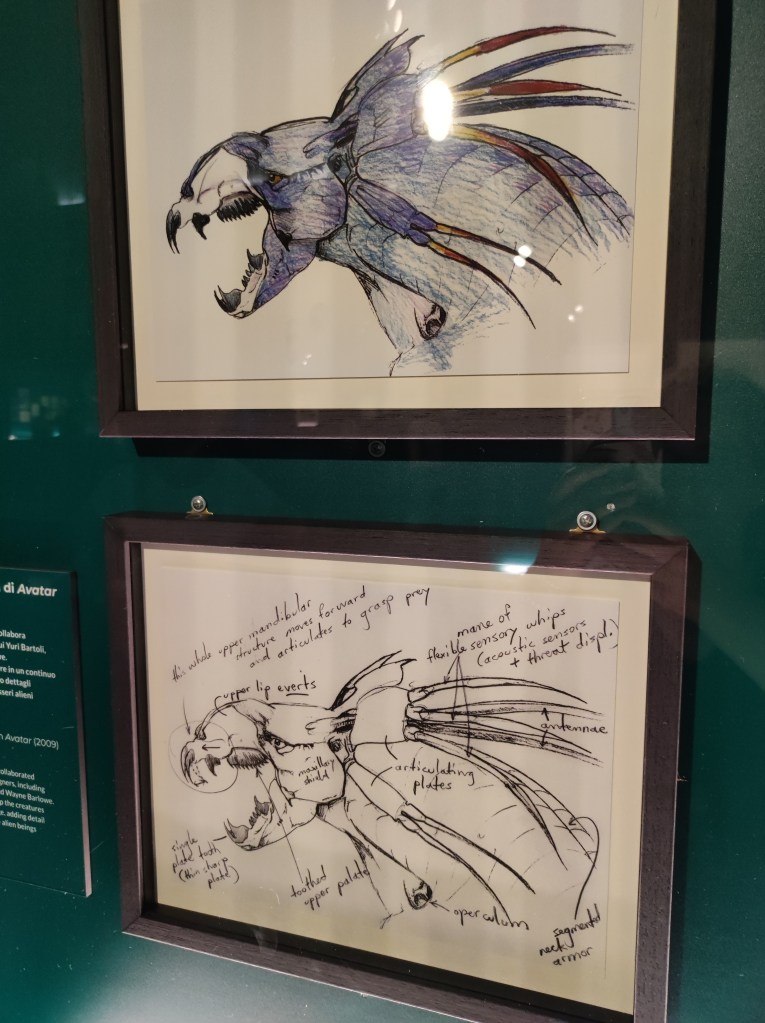 Le visiteur suit le parcours en colimaçon, qui longe les vertigineuses façades du bâtiment. On découvre les croquis réalisés pour des films mythiques : les cabines du Titanic, des fusils d’assaut pour le film Alien, la métamorphose de Schwarzenegger dans Terminator. Plus récemment, c’est le projet Avatar qui occupe le temps du réalisateur de 70 ans. Le 5ème et ultime volet de la saga est prévu pour 2031, mais verra-t-il seulement la fin de son œuvre ?